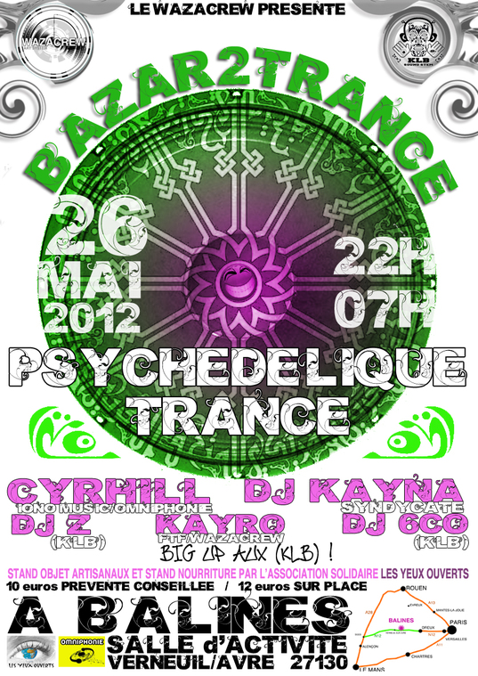 Le samedi 26 Mai 2012 de 22h à 7h&hellip "BAZAR2TRANCE" A Bâlines (Eure 27) NUIT DUBSTEP / techno / PSYTRANCE 12€ Sur place "capacité limité 300 places" 10€ prévente "fortement conseillé" sur : *** PRE-VENTES : http://www.weezevent.com/BAZAR2TRANCE AVEC CYRHILL _IONO MUSIC / OMNIPHONIE http://soundcloud.com/cyrhill Dj KAYNA http://www.myspace.com/kaynasty23 Dj Z _KLB http://m.soundcloud.com/z_klb Dj 6CO _KLB http://www.mixcloud.com/tag/6co/ KAYRO_FTF/WAZACREW rec._ facebook/kayro ftf wazacrew Stand et Nourriture par l'association "LES YEUX OUVERT" L&rsquoassociation Les yeux ouverts poursuit l'objectif de voyager en s'impliquant en tant qu'être humain solidaire en s'ouvrant aux situations que se présente à elle, en réalisant des actions d'aide à la résolution de problèmes vitaux ou de dignité humaine. Les yeux ouverts met l'accent sur les jeunes, l'éducation, l'aide à l'autonomie. En partenariat avec Nixospeed Cbmpkt |