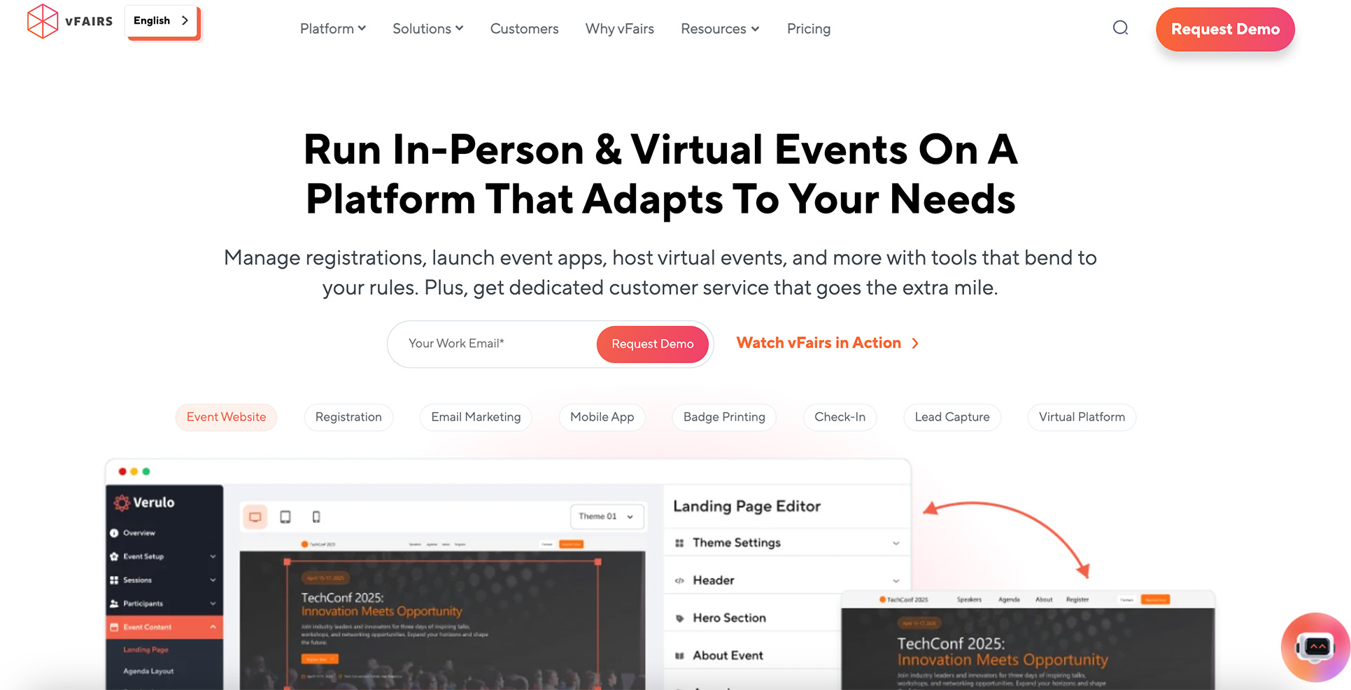 - Built-in website builder and content management system for landing pages, SEO content and event pages.