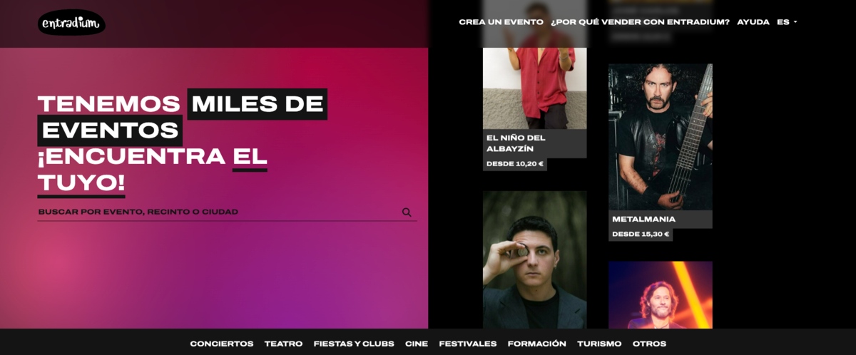 Entradium es una plataforma de venta de entradas de origen español, muy implantada en el sector cultural independiente. Su propuesta se centra en ofrecer una herramienta sencilla y accesible para organizar conciertos, espectáculos o eventos locales, con una lógica de uso directa y sin complejidad técnica. Es especialmente utilizada por promotores independientes, salas y pequeños festivales que buscan una solución rápida de activar y fácil de gestionar en el día a día.