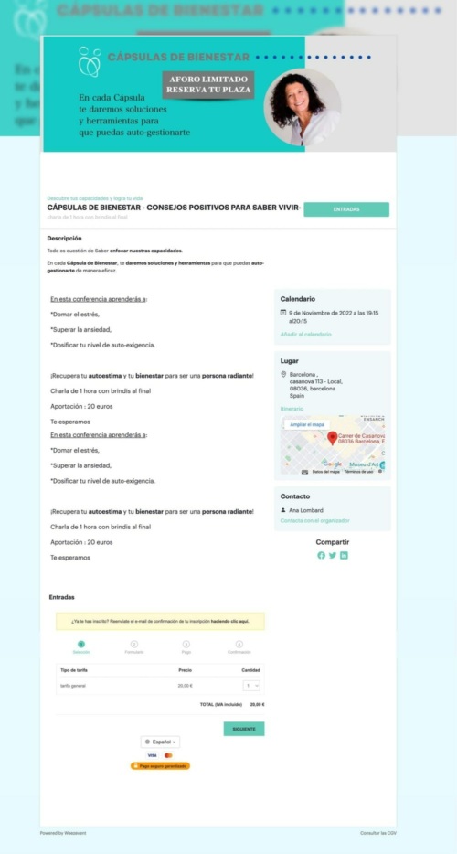 Magnífico sistema para crear y gestionar las inscripciones para un evento de una asociación. La configuración es intuitiva y sencilla, y ofrece un sinfín de posibilidades. Además, si el evento es gratuito, ¡Weezeevent no cobra comisión! Lo recomiendo.