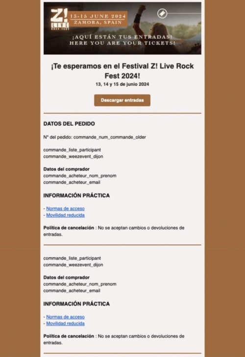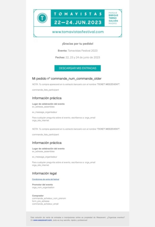 El software de venta de entradas Weezevent ofrece a los organizadores la posibilidad de agrupar todos sus eventos en una única página de venta de entradas online. Si organizas varios eventos al mismo tiempo, esta solución facilita mucho la compra de entradas a los asistentes. Para configurar esta oción, consulta nuestra página de ayuda online.