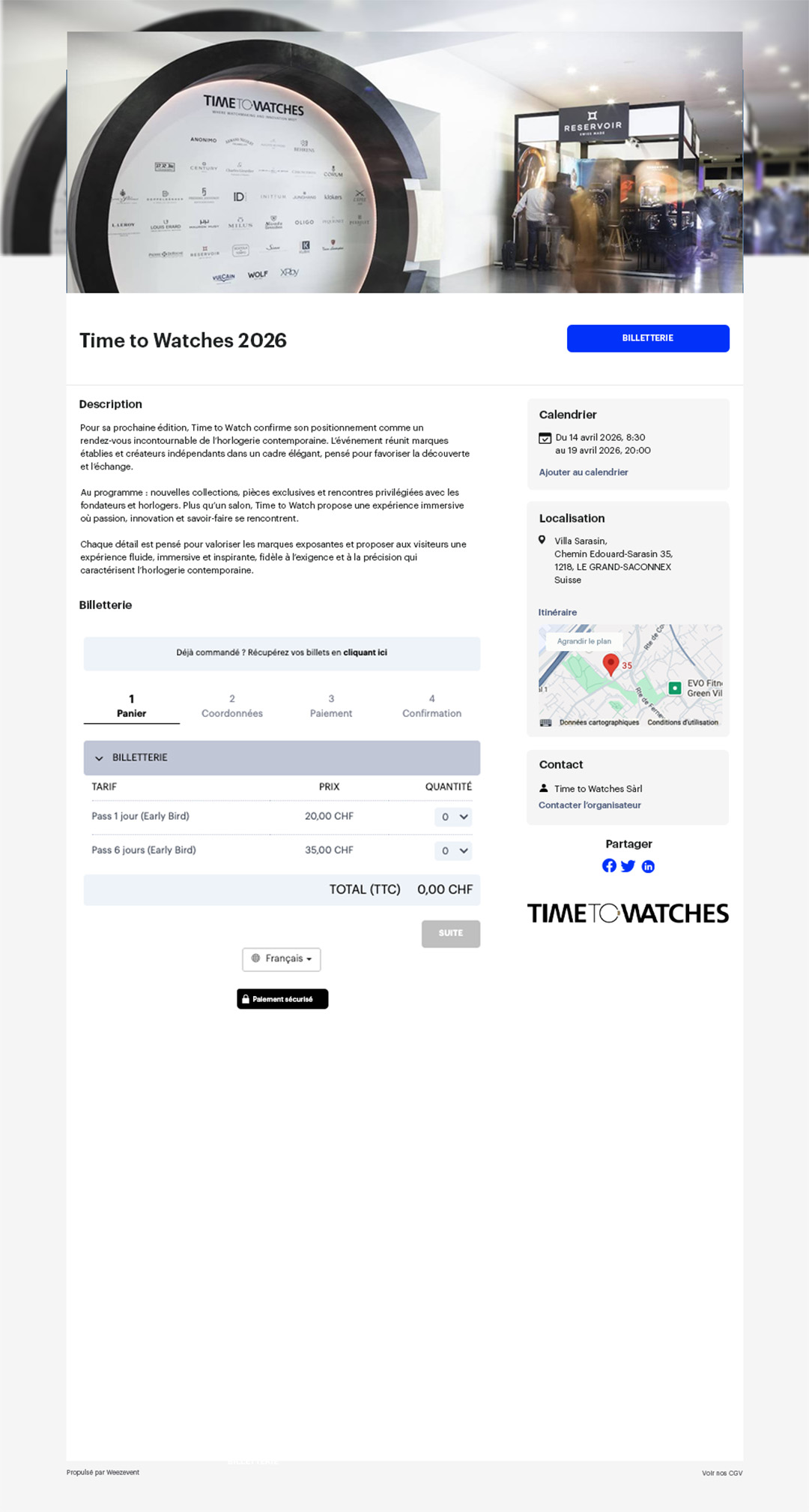 • Standard : pour les événements payants de toutes tailles. Forfait fixe de 240 CHF ou 290 CHF pour les événements à Lausanne (gestion de l’impôt local) + 1 CHF et 2,9 % par billet.