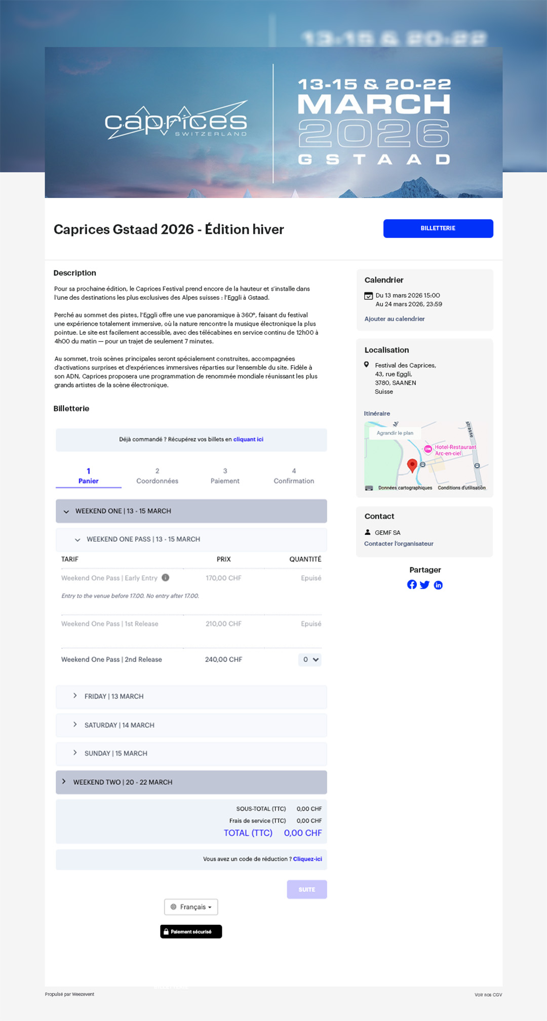 Weezevent prend en charge les principaux moyens de paiement utilisés par le public suisse, afin de faciliter l’achat des billets et limiter les abandons en cours de commande. Les paiements par carte bancaire (Visa, MasterCard, Post Finance) et Twint sont inclus sans frais supplémentaires. Des options de paiement comme PayPal, Klarna ou American Express sont également disponibles, avec des frais additionnels spécifiques à ces moyens de paiement. Cette flexibilité permet de répondre aux habitudes des participants tout en gardant une tarification claire côté organisateur.