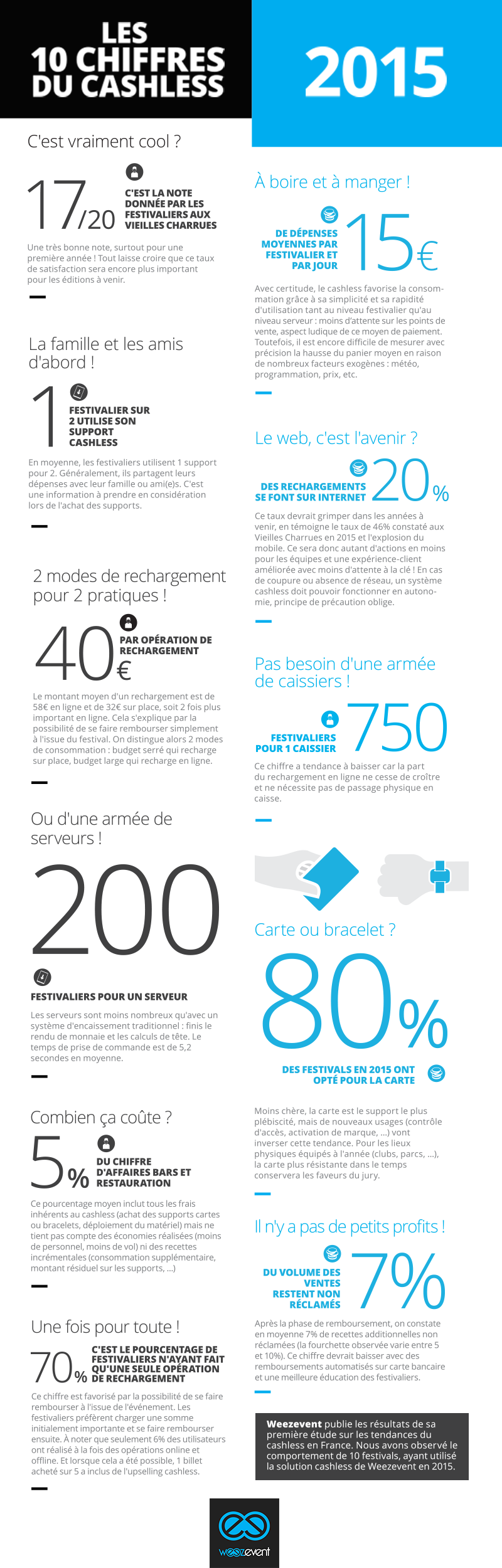 Fort de 3 ans de déploiement cashless dans plus de 200 festivals et événements , Weezevent a réalisé un retour d’expérience et en a ressorti pour vous les 15 chiffres clés du cashless.