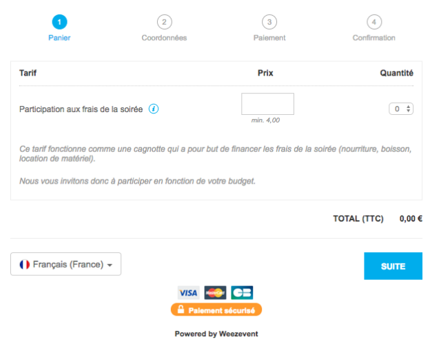 Dans votre cas la mise en place d’un tarif servira principalement à participer aux dépenses (nourriture, boissons, location de matériel…). Le choix le plus judicieux qui s’offre à vous, est d’opter pour un prix libre. Ce type de prix sera adapté pour laisser à vos convives la possibilité de participer en fonction de leurs ressources.