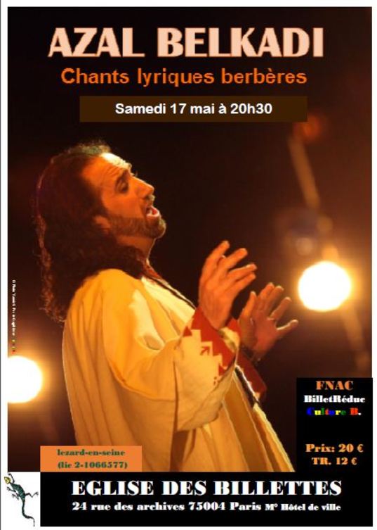 Azal Belkadi ne cesse d'éblouir son public par ses multiples talents. Ce jeune créateur, ancien étudiant des beaux-arts, ne s'est pourtant pas confiné dans les arts plastiques. A la recherche incessante de l’authenticité, c’est dans ses racines amazighes berbères qu’il trouve sa principale inspiration. Un pays aux milles sonorités et autant de couleurs. Un décor resplendissant que l'artiste Azal Belkadi tente de restituer à travers chacun de ses spectacles. D'abord à l'aide d'une bouleversante voix de ténor, une voix qui traverse les siècles pour déclamer des chants anciens subtilisés à l'oubli, devant un public immanquablement transporté par tant d'intensité vocale. Chaque prestation est une explosion d'émotions. La femme amazighe est très présente dans les œuvres de ce talentueux artiste. Elle est sublimée et élevée au rang de Déesse, car sans elle la culture ancestrale aurait dépéri depuis lurette…D'ailleurs chacun de ses spectacles lyriques est une occasion de rendre hommage à la diva kabyle, pionnière du chant lyrique berbère, Margueritte-Taos Amrouche, en interprétant quelques un de ses chants, tous inspirés du riche patrimoine local. Avec son frère Jean-El-Mouhoub Amrouche, elle avait accompli un louable travail de mémoire en Kabylie, en sauvant plusieurs airs et textes d'une disparition certaine.