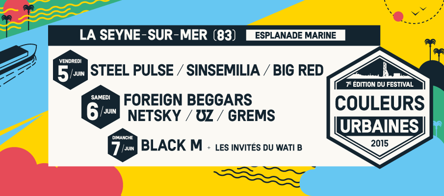 Le Festival Couleurs Urbaines revient les 5, 6 et 7 juin 2015 à la Seyne sur Mer (83). Mais il ne reviendra pas seul ! Pour cette nouvelle édition une collaboration avec Panda Events & Les Plages Electroniques a vu le jour avec l’arrivée d’une nouvelle couleur musicale : la Bass Music. L'Esplanade Marine de la Seyne sur Mer vibrera aux sons des basses durant deux jours consécutifs !