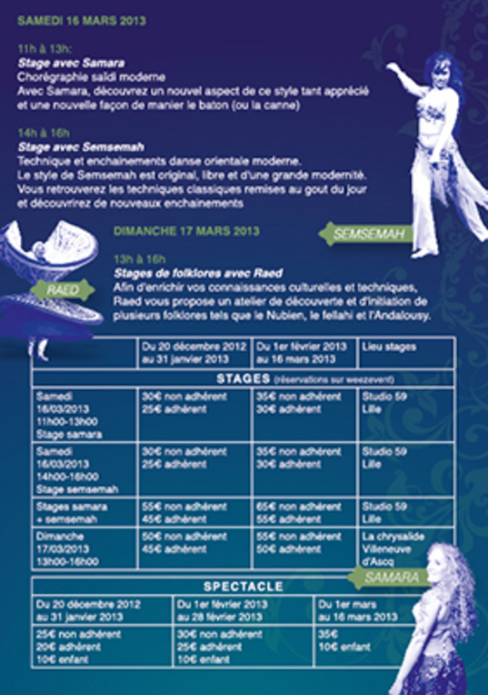 - Andalousy : Travail de grâce, de positionnement dans l'espace et de précision, ce stage d'andalousy vous permettra de fluidifier votre danse et de découvrir une des facettes de la culture arabo-andalouse. Précise et aérienne, cette danse vous fera voyager le temps de quelques heures dans un monde empreint de poésie et de raffinement.